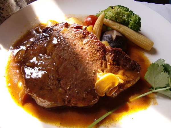 牛排超大塊,厚度約1cm,肉質細嫩,醬汁獨特,配菜豐富,有馬鈴薯、花椰菜、玉米筍、番茄…還有一大堆啦~紳士熊的腦袋很小,很難記太多ㄟ…